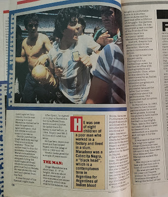 Because of his exceptional abilities, Maradona has borne the brunt of the defenders' attacks on him. Time and time again, during the course of a match, he hits the ground, sometimes with great force, sometimes with great skill in order to minimise the damage. And yet, he has shown remarkable courage and persistence.