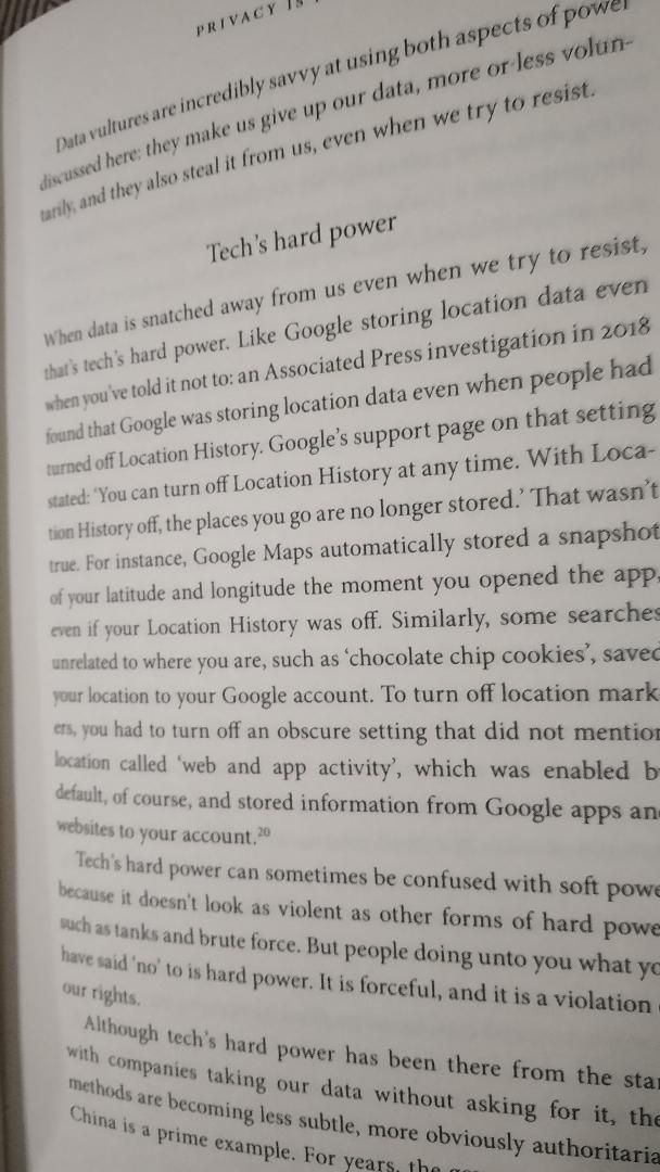 The author, Carissa Veliz, makes clear that you are under 24-hour surveillance by Big Tech companies like Google and Facebook. They study what you do, who are your colleagues, where do you go for vacations, what you like to eat, who are your friends, your relationship with your spouse and children, the type of stuff you buy, the moves you like to see and your political beliefs.