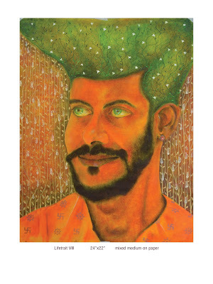 Another portrait, all mixed medium on paper, is of Girish’s eight-year-old daughter Arya. But she looks much older, almost as if she is in her early twenties, looking straight ahead, with thick hair and a bindi in the middle of her forehead. “My daughter is much more mature than her years and very confident,” says Girish. “I feel there is an older person inside her. Arya looks after her younger brother in the same way my wife looks after him.”