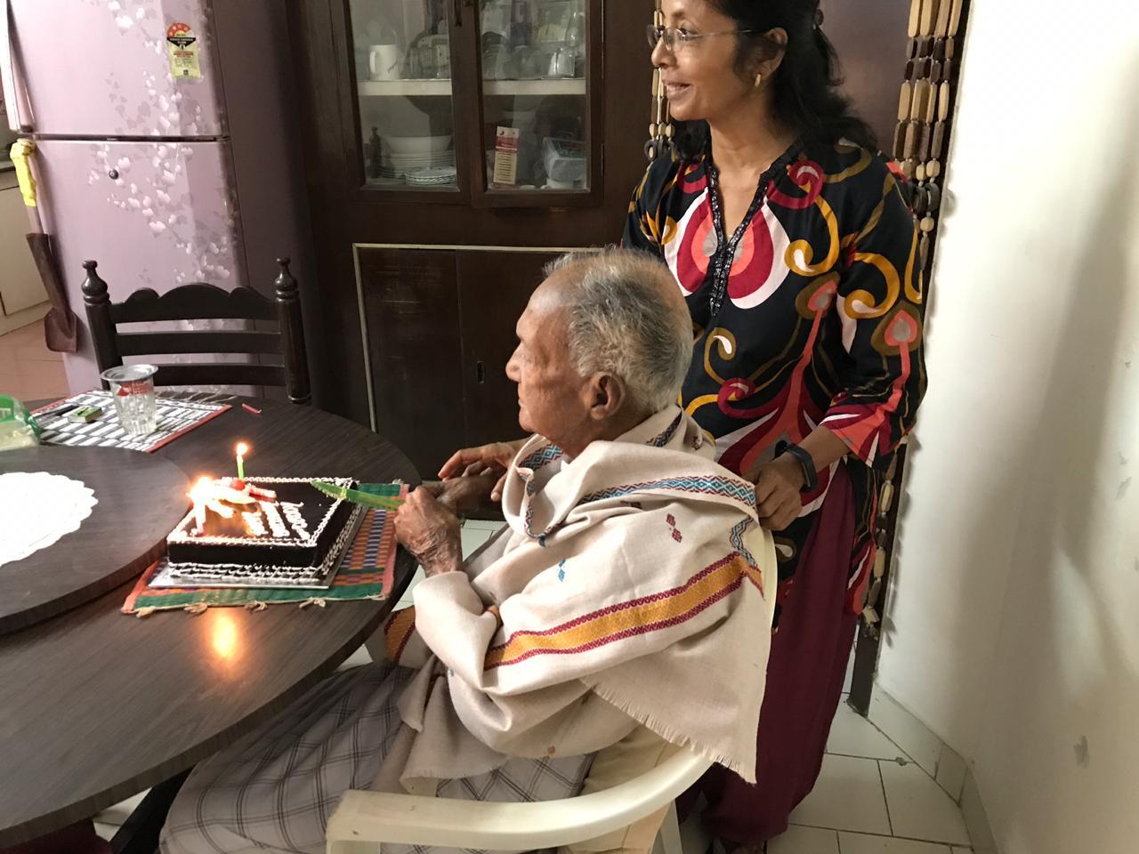 George was in a nostalgic mood because it was his 103rd birthday too. He was wrapped in a white shawl and wore a dhoti. His daughter Anly and grandson Anish flew in from Kochi to spend the day with him. A chocolate cake, with the words, ‘Happy Birthday Daddy’ in white icing was placed in front of him at the dining room. There were three candles. He blew them out with a smile while Anly helped him to cut the cake.