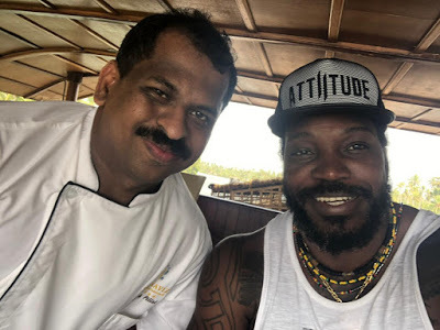 Chris is accompanied by his girlfriend Natasha Berridge and two-year-old daughter Crisalina. Corporate chef Suresh Pillai places a sizzling pearlspot fish on a green leaf in front of the cricketer. Chris takes a fork and digs into the fish. After a while, he looks up and says, “It’s good, man.”
