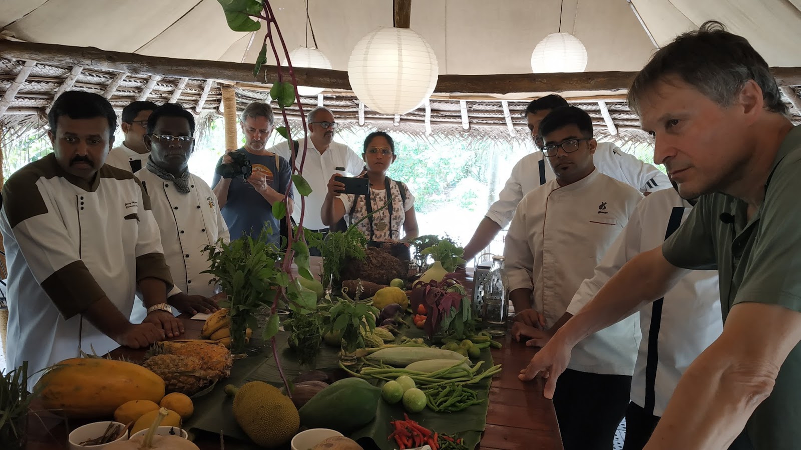 Several chefs of the CGH group, in their starched white-and-black uniforms, listened attentively. The tall Claus, dressed casually in a green T-shirt and khaki Bermuda shorts, and brown sandals, says, “So you have to find a way to tell the story about this leaf. You have to tell it, not only with words but also through the food itself. Maybe, you can add some mango and ginger. Instead of using a lot of spices, you could try to retain the fragrance.”
