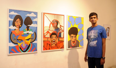 Photos: Rohit Anand in front of his work; Ajai Vadakkath (centre) with a few artists; artist Pranav Nair's work, 'Why I Love Google'. Pics by A. Sanesh