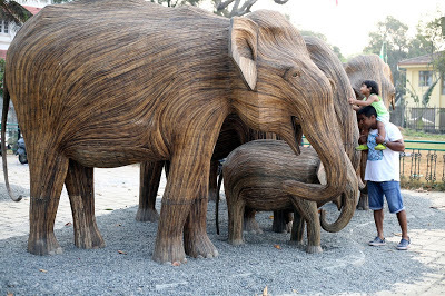 The method is simple. A steel frame, in the shape of an elephant, is made -- the curved back, the long trunk and the thick legs. Then they cut the bushes. Thereafter, the sticks are boiled and shaved down. One layer of sticks is tied to the frame. Then a second layer is hammered in. “It's a very slow process,” says Tarsh. “Six people take one-and-a-half months to make one elephant. Varnish has been imported from the UK to provide an effective waterproofing.”