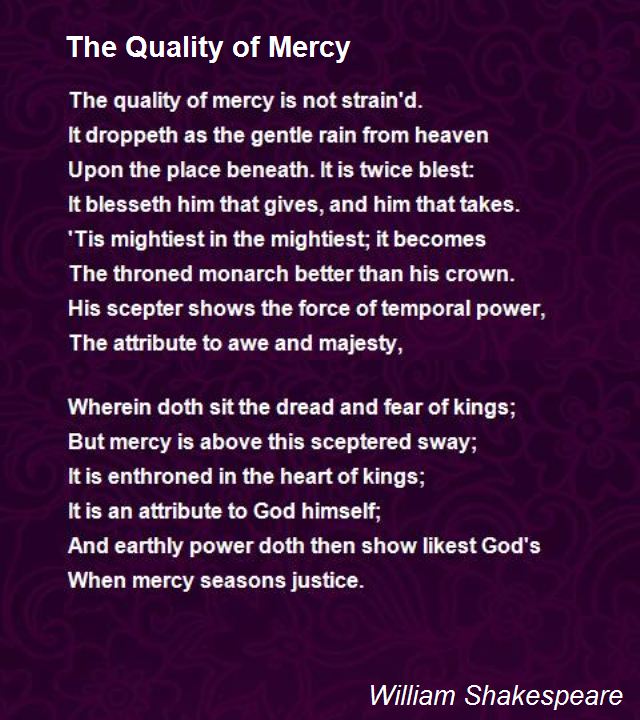 “The quality of mercy is not strained,It droppeth as the gentle rain from heavenUpon the place beneath: it is twice blest;It blesseth him that gives and him that takes.”