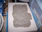 A few more photos today. First of all, here’s the ratty slab sculpture from pottery class that I promised to show you. I was going to stick a tail on the back but he got a little too hard to add anything to so I cut the tail into the back instead. Then I got carried away with the carving and scoring so he ended up decorated all over. We’ll see what he looks like once he’s been glazed.