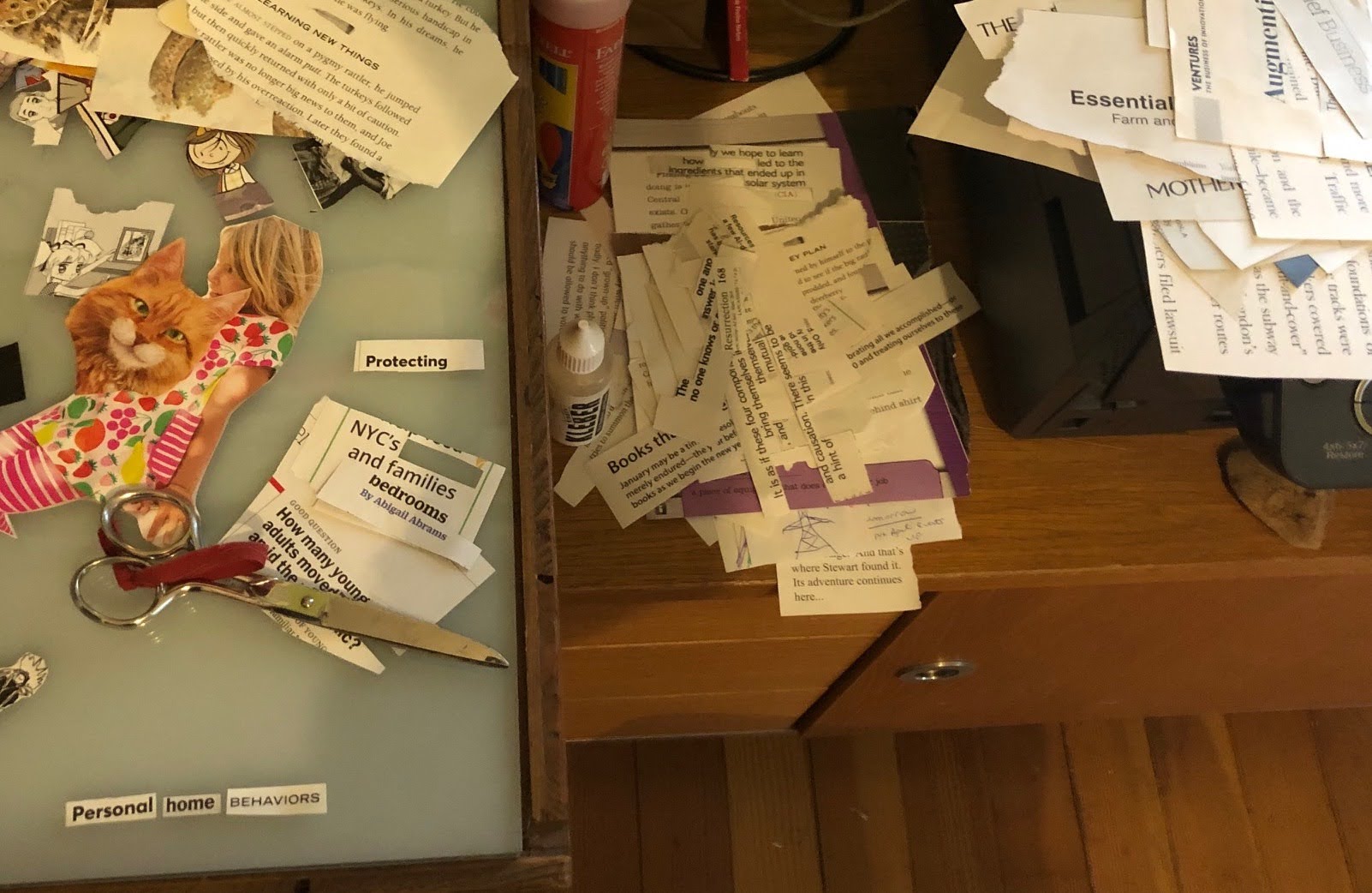 I've arranged the text into piles of small, medium and large font. Once I make a word choice, I dig into the corresponding font pile and search for completing pieces until the phrase captures the theme. I never try to force it, and never for look for a particular word (with the exception of a conjunction or article). There have been some times where I've spent as much time on the word puzzles as I did on the picture puzzle.