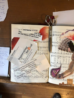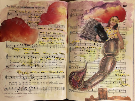 I use this title as starting point for the stream of consciousness pieces that follow. It's a kind of free writing style that I used to do all the time, and it's been great revisiting it without having to worry about coherency and plot structure. At the same time, there is a plot trajectory within the project as a whole. Each spread or page are pieces designed to borrow from the "hymn" structure of the book I'm altering.
