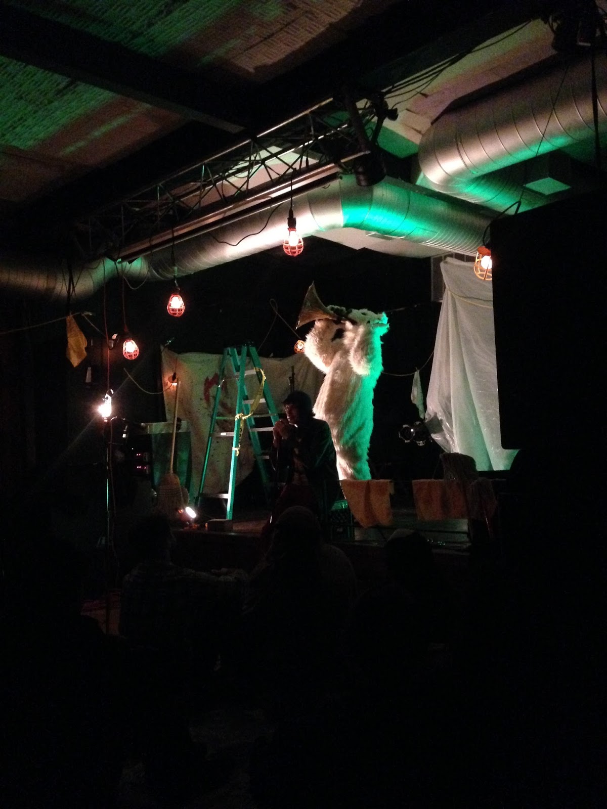 We had no idea what to expect from this, and walking into the place, we still had no idea. The stage area was curtained off and everybody had to wait in the bar. When they opened the curtains, it was apparent that we were in for something very different. The entire floor was covered in tarps and janitor equipment was spread throughout the room. Everybody was instructed to have a seat on the tarps and waited. About a half hour later, all the lights went dark, alarms rang out...and thus began our evening.