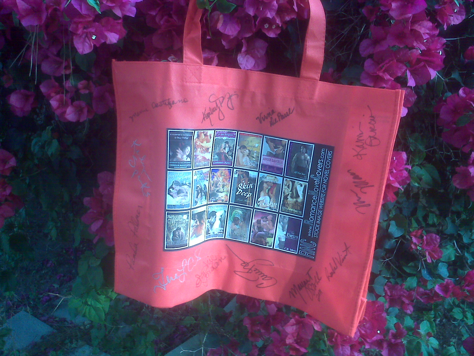 If you like signed swag, then today's giveaway is pretty darned cool. First, it's a way cool, cherry red tote bag with romance book covers on the front and the back.