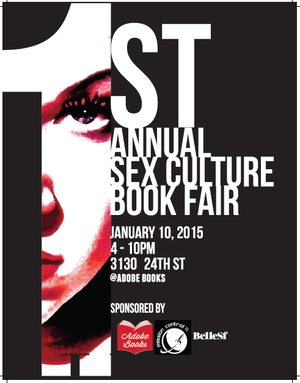 The Sex Culture Book Fair is a collaboration between Adobe Books and Arts Cooperative, Belle SF magazine, and Mission Control sex positive social club. Together they will present the past present and future of publishing and sex with a line up of presenters, readers, storytellers, and demonstrations.