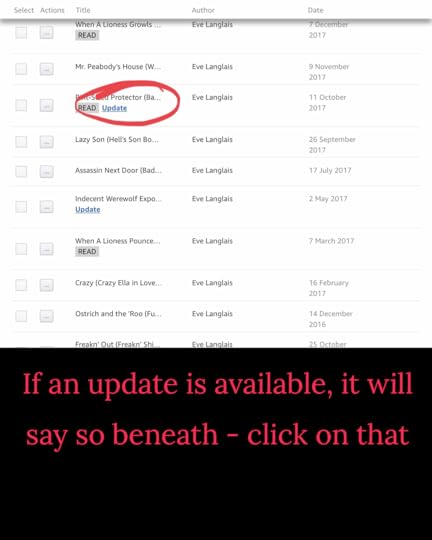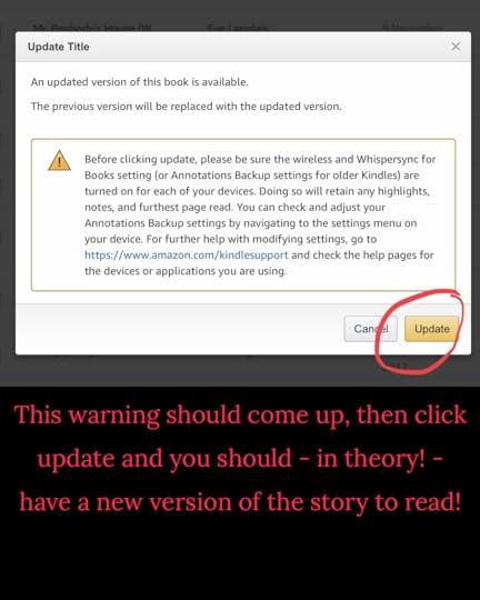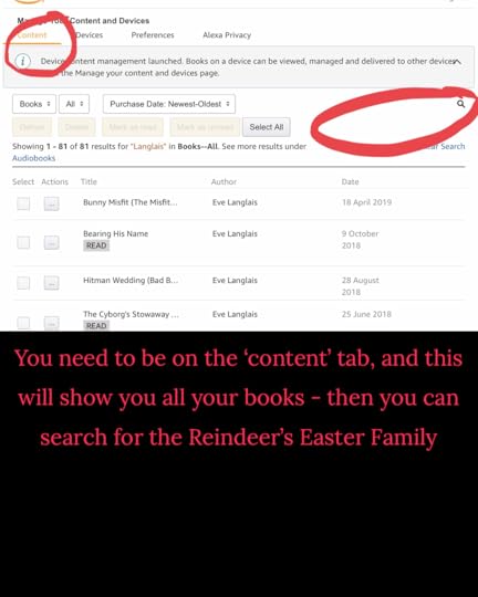 HelloOne of the complaints about The Reindeer's Easter Family was that it was too short. Soooooo I've added a little bit more to the story, and it is now available from Amazon. If you've already bought it, you should be able to just download the update - if you've never done this before, there are pics and instructions below (which in theory should work... in theory... I have done it before for myself, so it should work... in theory!). There isn't a huge deal more in there - the story has not changed - but there are a few more scenes, so is worth updating. While you do update that story, check out my others to see if there are other updates available. : )Take careElizabeth