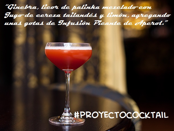 Ginebra, Licor de Palinka mezclado con Jugo de cereza tailandés y limón;agregando unas gotas de Infusión Picante de Aperol