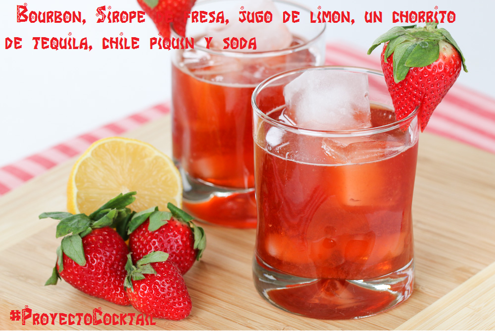 Bourbon, Sirope de fresa,Jugo de limón, un chorrito de Tequila, Chile piquín y Soda