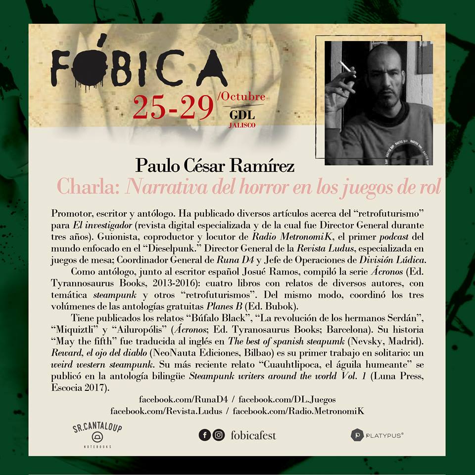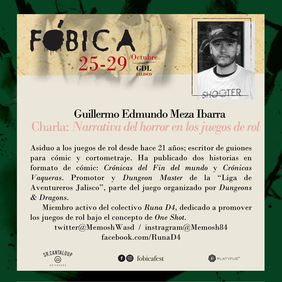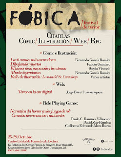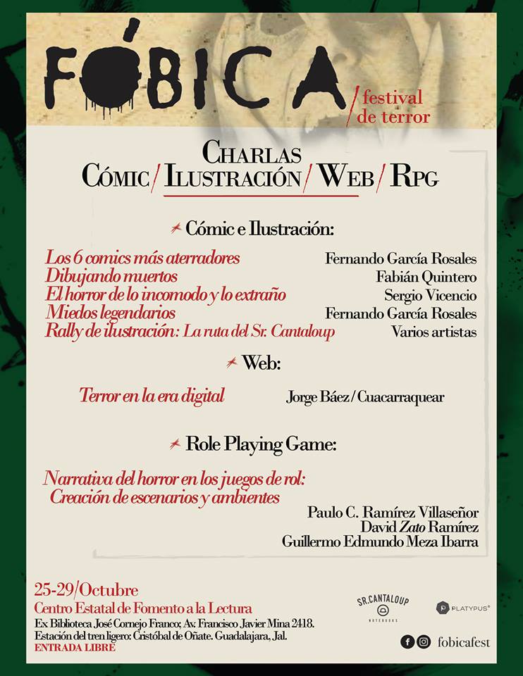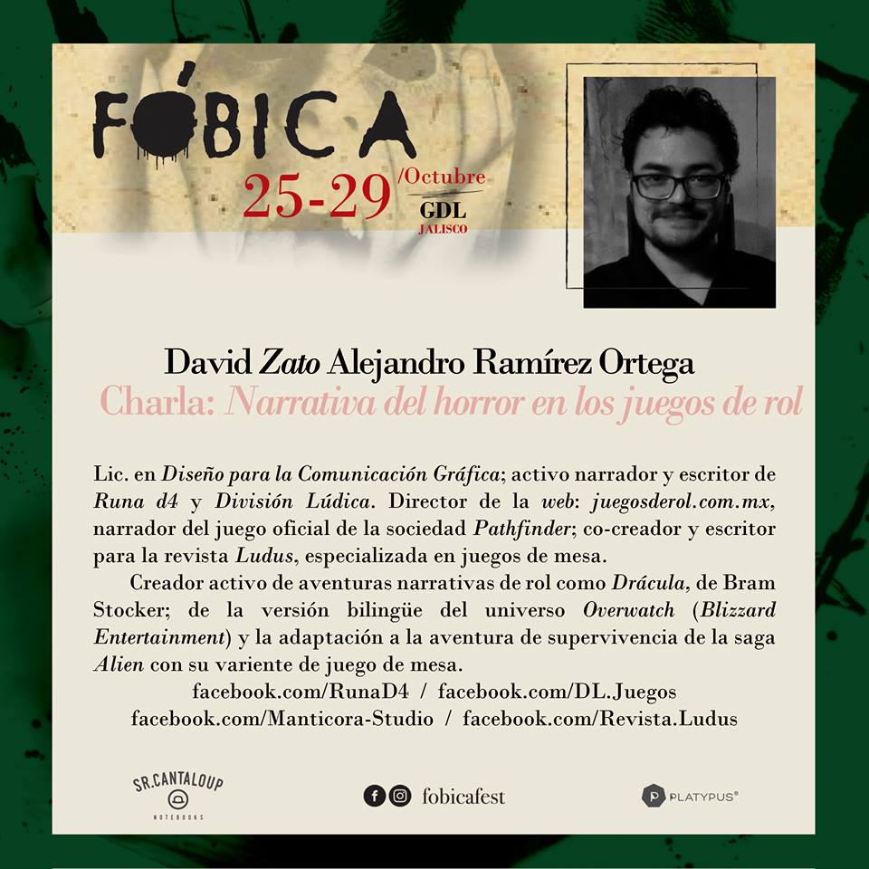 Así que, durante el mes de octubre con la División Lúdica y apoyados con Runa D4, abrimos el Ciclo de Terror con juegos de rol de la temática y además cerraremos con una charla acerca de la "Narrativa del horror en los juegos de rol" en el Festival de Terror Fóbica un festival con literatura, cine, cómic, cortometraje, talleres, charlas y todo alrededor del género de horror.