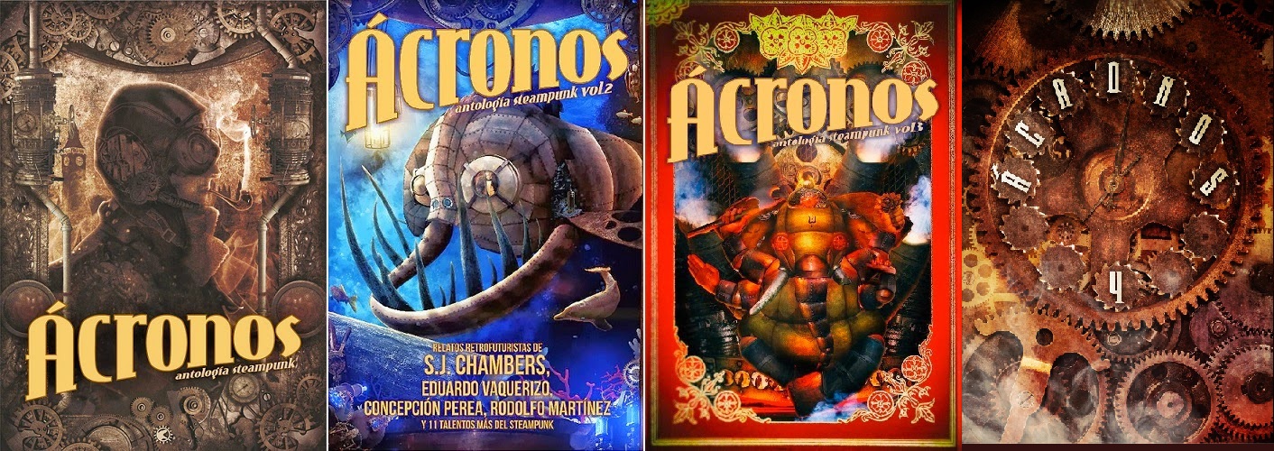 Serie "Ácronos Antología Steampunk Vol. 1-4"Coordinar la serie de antologías Ácronos, publicadas en España del 2013-2016, en cuyas páginas aparecen mis relatos "Búfalo Black", "La revolución de los hermanos Serdán", "Miquiztli" y "Ailuropólis" respectivamente, ha sido uno de los logros más importantes alcanzados, dado a lo que costó.