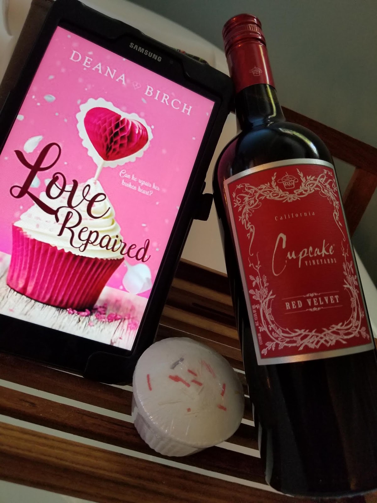 The wine: I picked a Cupcake wine because it’s a running theme in the story. Things kick off with Ben swiping one that Amee had left in her car. If you like smooth reds that aren’t too dry and lean a little sweet you’ll enjoy the Red Velvet. It’s not heavy and has a pleasant rich taste. It’s one of my favorites from this company.The bath bomb: Keeping with the cupcake theme, I got a bomb to match. It was a vanilla scented cupcake with sprinkles. Cute right? Sadly once in the water the scent dissolved as the bath bomb did. There was no lingering fragrance to add to my overall relaxation. No link for this one as it was a set of four that I picked up at Marshall’s.