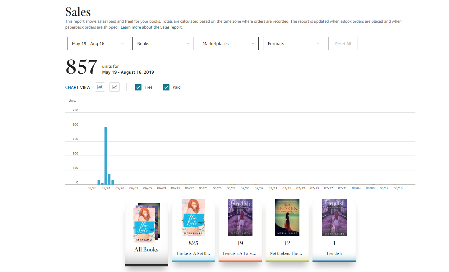 “Sale” wise 831, but you’ll notice that’s in quotes reason being most of those were FREE downloads. I ran a free promotion on The Lists from May 22-May 26 the majority of those numbers reflect what was given away. Because I didn’t want to sink a lot of money into promoting giving away my book, I did low cost options. Ran a promo on Love Kissed Book Bargains ($15) BUT if you’re part of their Facebook group, they have coupon codes so I only paid $5. The day it ran netted me the biggest download day (596). My other promotions were simply on my social media. I had a second smaller reach one ($10) and the day it ran I only had 20 downloads, the lowest day across the board.