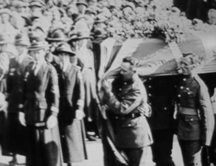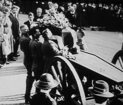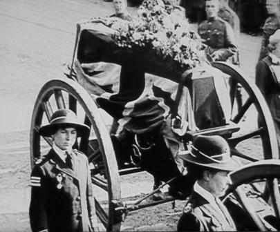 A horse-drawn caisson carries Edith Cavell’s coffin through the streets of Norwich in 1919