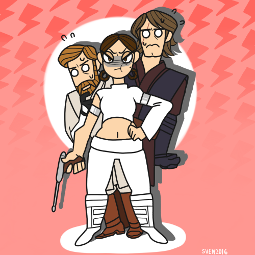 In that first picture that’s not how Anakin and Obi-Wan’s hair are supposed to be for the situation being depicted, that’s the hair style they had in Episode 3 Revenge of the Sith but the time when Padme wore that outfit and had the gun was in Episode 2 Attack of the Clones and Obi-Wan’s hair should be longer and Anakin should have the shorter hair with that bullshit side-rat-tail and also he shouldn’t have a scar yet, this art is still very nice and I like its message and I didn’t like the prequels either but I am burdened with this knowledge and I don’t want anyone to change or do anything I think everyone’s the best at all times, including me which is why I’m celebrating myself by sharing the knowledge that I have, and if we’re nitpicking (which we’re never not) Anakin’s also wearing the wrong outfit for the situation.