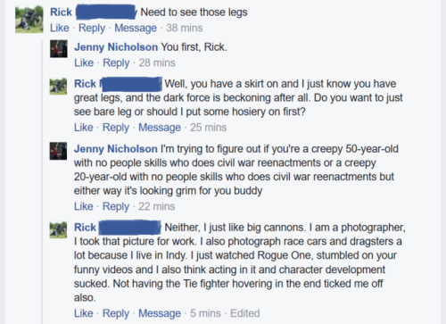 My step sister was driving through Wyoming once, near Ford’s ranch. She stops for gas, and as she’s filling up, this huge motorcycle roars in behind her, scared the pants off her. The rider, dressed in all black steps off, and she yells at him “who do you think you are blasting in here like that, you Darth Vader looking motherfucker?”. He takes off the helmet, and it’s Harrison Ford, and without missing a beat he says