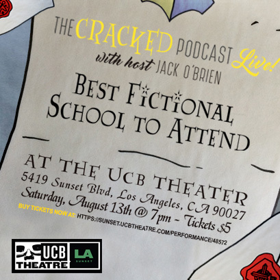 Join Jack, Daniel, the rest of the Cracked staff, along with comedians Brandie Posey, Steven Wilber, Riley Silverman, & Alison Leiby as they figure out if it’s a realistic school like Degrassi or West Beverly High, or an institution from a fantasy world like Hogwarts with its ghosts and dementors, or Bayside High, haunted by a monster known only to humans as ‘Screech.’
