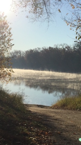 AM mist above the water on the riverI spent the last two days doing the 10 1/2 or 11 mile runs on the river trails. Since my hamstring and ankle injuries, I have not run good distances back to back. Everything went as well or slightly better than I would've expected. Again, I felt in the zone, and lucky to be able to experience the ever-changing beauty of these trails. I rarely really run with the camera. For once, I took some time and stopped to take photos and smell the proverbial roses.