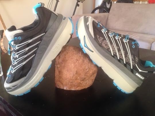 I knocked out 39 miles last week. 29 were on trails. I normally try to get in around 30 mile each week. But my running club, the Lawrence Trail Hawks, were hosting the 10K and 25K Sanders Saunter trail races over the weekend, and I opted to volunteer rather than run. So I did my normal 10-ish mile Saturday run on Friday. I ran 18 miles in the new Hoka Mafates. The shoes took a bit of getting used to on steep downhills and turns. But overall, I found them to be quite adequate for hilly, somewhat rocky terrain. On Friday I wore them on the flat sandy surface of the levee. For that run, I felt good. My feet were incredibly comfortable with the mattress-like feel of the thick soles. I don't know if it was the height, the drop, or the very slight difference in weight of the Hokas vs my Mizuno road shoes (the Hokas are a bit heavier), but I did have a bit of muscle soreness in my quads (where I never experience problems) after the run. I will attribute it to an adjustment issue. All in all, my first week with the oversize soles was fun.