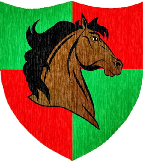 El busto de un corcel marrón sobre un fondo bicolor, rojo y verde.