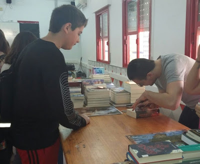 Después de la charla con los alumnos y haber tenido la ocasión de firmar ejemplares durante los recreos de los cuatro días que duró la feria, solo puedo decir que me ha vuelto a sorprender muy gratamente al ver la gran cantidad de alumnos que leen. Y sobre todo quiero destacar la ilusión con la que acudían para comprar sus libros favoritos o para que les firmásemos ejemplares de nuestras novelas.
