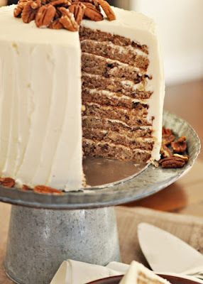 Place 1 cake layer on a serving platter. Spread 1 cup Cream Cheese Frosting over cake layer. Top with second layer, and spread 1 cup frosting over cake layer. Top with third cake layer, and spread top and sides of cake with remaining frosting. Arrange toasted pecan halves in a circular pattern over top of cake.