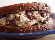 Ingredients:1 1/2 cups chopped leftover roasted chicken or rotisserie chicken1/3 cup mayonnaise1 teaspoon Dijon mustard1/3 cup dried cranberries1/4 cup chopped pecans1/4 cup thinly sliced green onions8 slices of breadMethod:Combine all ingredients (except the bread) in a mixing bowl. Stir well.Toast two slices of bread per sandwich. Top with 1/2 cup of chicken salad.Cut in half on a bias and serve.http://www.culicurious.com/chicken-salad-recipe-with-cranberries-pecans/