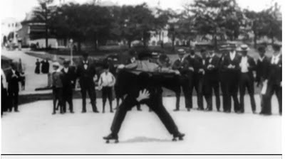 Patineur Grotesque shows a bearded man, dressed in a top hat and smoking a cigar, rollerskating in a park before a circle of onlookers. He stops and lifts his jacket to reveal a white hand print on the bottom of his trousers in a cheeky gesture to the camera."