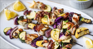 Chicken Skewers1 lb boneless, skinless chicken breast5 slices nitrate-free bacon1/2 head red cabbage2 zucchini2 yellow squash1/2 red onionRanch Marinade1 cup coconut cream1/4 cup avocado oil (you can substitute olive oil, but it will yield a more distinct flavor than avocado oil)2 Tbls apple cider vinegar1 Tbls dried chives1 Tbls drived parsley1 tsp dried dill1 tsp granulated garlic1 tsp sea salt1/2 tsp onion powder