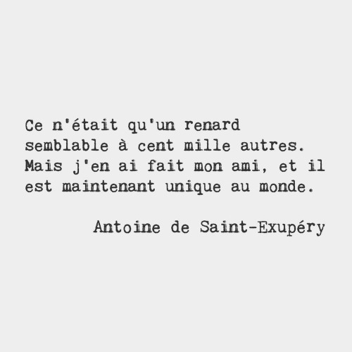 He was only a fox like a hundred thousand other foxes. But I have made him my friend, and now he is unique in all the world. — Antoine de Saint-Exupéry, French writer