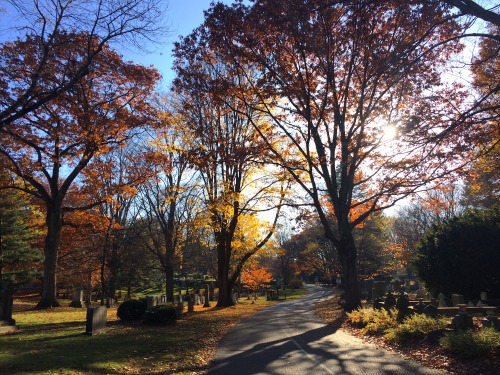Massachusetts, one stands above the gravestones and one stands above the trees.