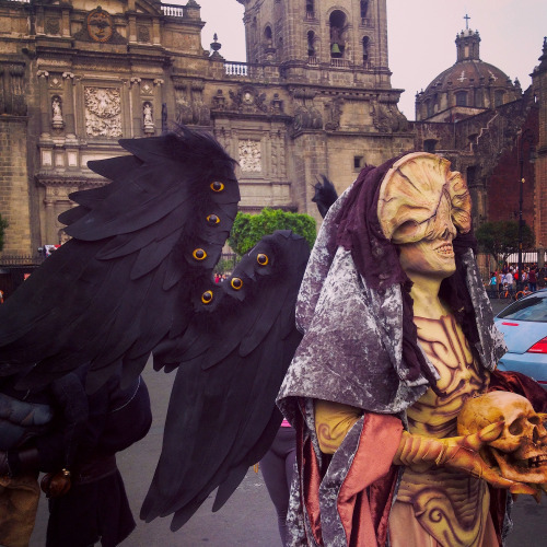 A short postcard from Mexico City. The costumes in the Zócalo yesterday for Day of the Dead were frightening. Monstrous, macabre. But not in all my life have I heard a noise that so signaled doom as the bells that rang from the Metropolitan Cathedral behind this black-winged creature. The sound washed over the massive plaza, discordant, registering in the chest, the skull, places in the brain you don’t always want to access. The largest of the twenty-five bells in the tall towers weighs 29,000 pounds. I heard every ounce of it. And now, as I try to remember what it sounded like, having heard it just yesterday, I cannot recall. A muteness in my memory, ghost sound, and that somehow renders it all the more awe-ful and all the more terrifying.