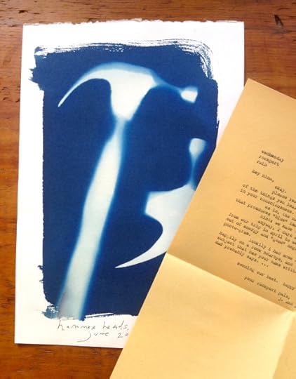 A good surprise in the mail yesterday. Old friend, photographer, teacher Joe Swayze sent me a HAMMER HEAD cyanotype, a process that uses sunlight and results in the summeriest blue, a type of photograph that I learned to make with him – (oh fuck) – twenty years ago. What a gift.