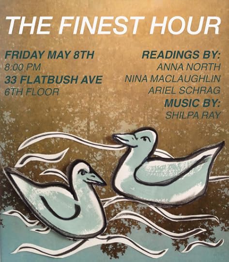 The Finest Hour is a free, quarterly reading and music series in Ft. Greene/downtown Brooklyn. Tonight, I’ve got the bigtime honor of sharing the bill with Ariel Schrag and Anna North. If you’re in New York, think about stopping by. I think it’s going to be very good.