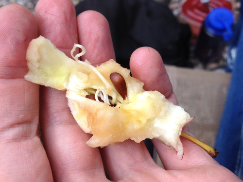I bit into my apple, who knows what kind, it was crisp and slightly gingered. I bit deep and broke through to the pocket where the seeds live. “Look!” Inside, the apple seeds had started sprouting, I’d never seen it happen before, the same white curl of sprout as the one in the crack in the wood of the deck, a white ribbon of growth, the quiet violence of life breaking out. “Spring has sprung,” M. said, and we laughed for a while at that. When the breeze blew, it brought to us the smell of honeysuckle.