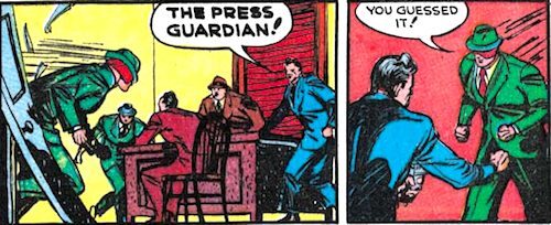 The Press Guardian is an obscure superhero from the Golden Age of Comic Books. Created by Jack Binder, the Press Guardian first appeared in the anthology-style Pep Comics #1 in January 1940, but was only featured in eleven issues before disappearing from publication. During the writing process, I was lucky enough to find a reprint of the series, which allowed me to incorporate aspects of and references to the original. I think the 1940 version is definitely fun, action-packed, and sometimes funny without intending to be. For example, in one issue, the Press Guardian is working at his own desk in the office of his secret identity, but he is still wearing his full superhero costume and tries to really play it off when a bunch of criminals burst into the room to attack his alter ego. Throughout these 66 golden age pages, the Press Guardian fights gangsters, spies, and corrupt politicians. He even battles a parody version of Nazi Germany called Moronia, but the Press Guardian’s main adversary is a crime boss named the Claw. Interestingly, this was all published by MLJ, which was the precursor to Archie Comics. The original Press Guardian was edited by Abner Sundell with artwork by Mort Meskin whose names often appear in the header. Meskin is also noteworthy for being posthumously inducted into the Will Eisner Hall of Fame in 2013 for his contributions to comics.