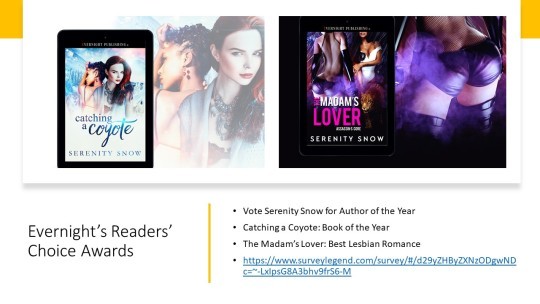 It’s The Evernight Reader’s Choice Awards! I’m up for three awards. Catching a Coyote: Book of the Year, Serenity Snow Author of the year and The Madam’s Lover: Best Lesbian Romance. I’d appreciate your votes. Thank you!