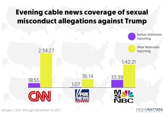 The vast majority of the reporting on the accusations made against Trump on evening cable news took place after The New York Times reported on October 5 about Hollywood producer Harvey Weinstein’s history of sexual harassment and assault. The so-called “Harvey effect” spurred women to come forward to discuss their experiences of sexual violence. In turn, the reporting on Weinstein also appeared to create an opening for cable news to bring up the allegations made against the president. In the nine months before The New York Timesreported on Weinstein, evening cable news spent less than an hour discussing the allegations made against Trump. However, in about 2 1/2 months after the Times reported on Weinstein, evening cable news devoted nearly five hours to reporting on the accusations against Trump.