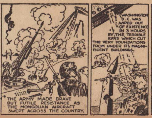 “Many years ago,” she says, “the Mongol Reds from the Gobi Desert conquered Asia from their great airships held aloft by gravity Repellor Rays. They destroyed Europe, then turned toward peace-loving America.” As their disintegrator beams boiled the oceans, annihilated the U.S. Navy, and demolished Washington, D.C. in just three hours, “government ceased to exist, and mobs, reduced to savagery, fought their way out of the cities to scatter and hide in the country. It was the death of a nation.” While the Mongols rebuilt 15 cities as centers of “super scientific magnificence” under their evil emperor, Americans led “hunted lives in the forests” until their “undying flame of freedom” led them to recapture “lost science” and “once more strike for freedom.”