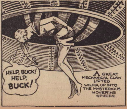 After a year of such cartoons filled with the worst of early-twentieth-century Asian stereotypes, just as Wilma is clinging to the airship of the Mongol Viceroy as it speeds across the Pacific, a mysterious metallic orb appears high in the sky and fires death rays, sending the Mongol ship “hissing into the sea.” With her anti-gravity “inertron” belt, the intrepid Wilma dives safely into the waves only to have a giant metal arm shoot out from the mysterious orb and pull her on board to reveal — “Horrors! What strange beings!” — Martians!