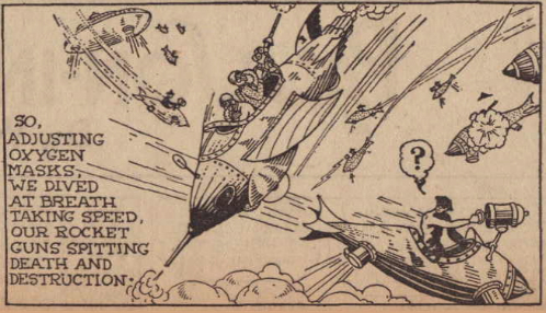 Staggering out of that mine, he finds himself in the 25th century surrounded by flying warriors shooting ray guns at each other. A Mongol spaceship overhead promptly spots him on its “television view plate” and fires its “disintegrator ray” at him. He’s saved from certain death by a flying woman warrior named Wilma who explains to him how this all came to be.