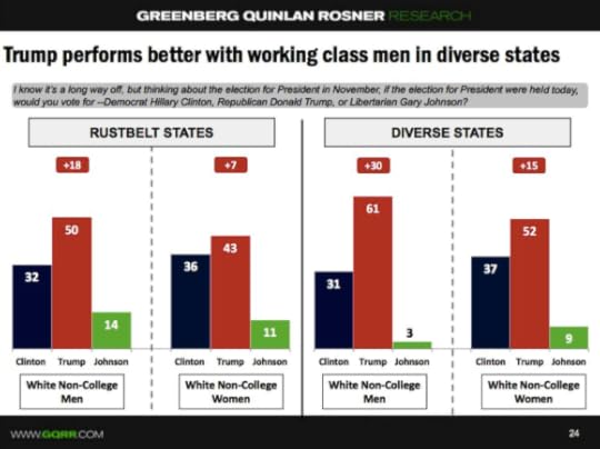According to one school of thought, Trump’s appeal to working-class white voters, combined with the impact of trade deals on the Rust Belt gives Trump a real shot at winning states like Pennsylvania and Michigan, where Democrats have won since 1992 with average margin of 9.2%. But Democracy Corps polled likely voters in nine target battleground states, and found that Trump was significantly weaker among white voters in the Rustbelt (Pennsylvania, Ohio, Wisconsin, Michigan, New Hampshire) than he was in more diverse states (Arizona, Florida, Nevada, North Carolina). He still carried them, but with much weaker margins: