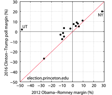 But this finding is supported in other ways as well. Back in early May, Sam Wang, proprietor of the Princeton Election Consortium, considered the possibility in a post titled, “Trump expands the battleground…to Utah and the Deep South.” As usual, Wang considered several different ways of approaching the question, but all pointed generally in the same direction: what little evidence of a shifting battleground existed, it tended to disfavor Trump. This was perhaps shown most clearly in following chart plotting state polls at that time against the 2012 election results: