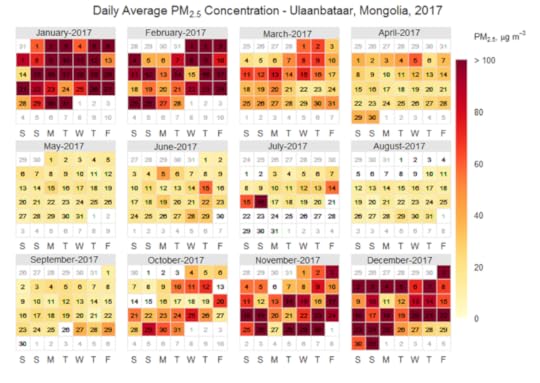 A calendar showing particulate matter concentration in Ulaanbataar, Mongolia in 2017. Note the highest concentrations appear in wintertime. The unusual increase in pollution in July corresponds with a Mongolian holiday.