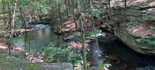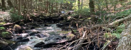 On a clear and breezy day we set off from Dave’s house, on foot, and made a seven-mile trek. The first and last mile were through conventional, indistinguishable suburban landscape. But for five miles we trekked through the Wachusett Watershed on a variety of easy rail trails; forested winding paths, a few glorious meadows, past a lovely lake, and into a rocky ravine neither of us had ever seen before. I christened it Quinapoxet Canyon, after the tributary eating away at eons of granite.